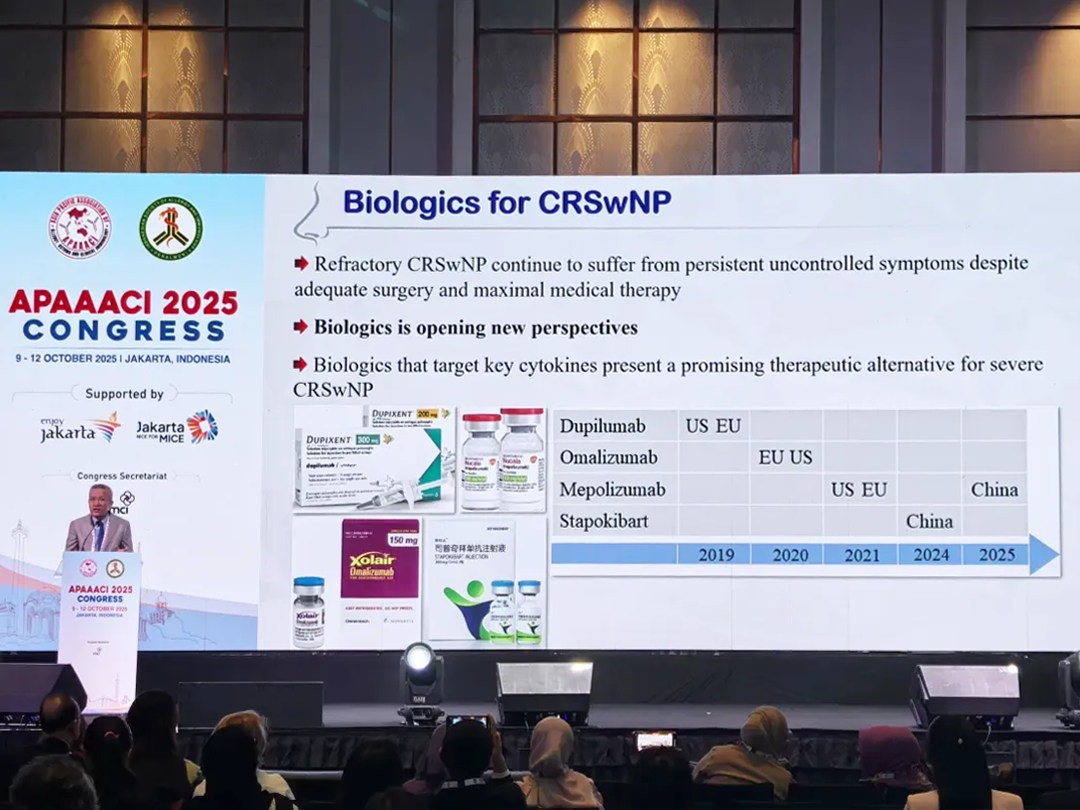 2025年10月9日至12日,由亚太过敏、哮喘与临床免疫学会(APAAACI)与印度尼西亚过敏与免疫学会(ISAI)联合举办的2025年APAAACI年会于印度尼西亚雅加达隆重召开,本次大会以“多元中的统一:推动过敏、哮喘与免疫学领域的科学与创新——从遗传学到细胞治疗”为主题,旨在融合最前沿的科学进展与临床实践经验,面向临床医生与科研人员,推动学术与实践的深度交流。上千位来自不同国家和地区的专家学者齐聚一堂,共同促进知识分享与跨领域合作,探讨应对过敏与免疫性疾病挑战和行业发展。司普奇拜单抗慢性鼻窦炎伴鼻息肉III期临床研究数据亮相本次大会,在国际舞台上展示中国的创新方案,获得与会专家的广泛关注。