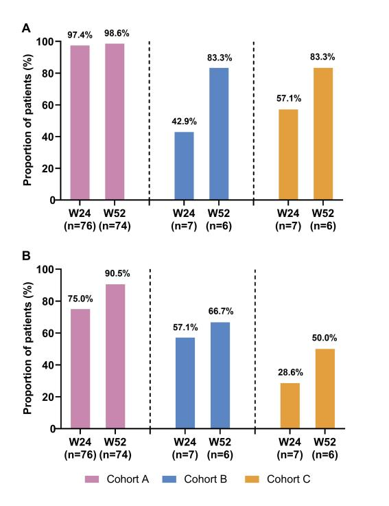 结果显示,A组患者在第24周和第52周分别有97.4%与98.6%维持NPS应答;B组24周NPS与鼻塞评分(NCS)应答率分别升高至42.9%与57.1%,而52周NPS与NCS应答率分别升高至83.3%与66.7%;C组24周NPS与NCS应答率分别升高至57.1%与28.6%,而52周NPS与NCS应答率分别升高至83.3%与50.0%(图4)。