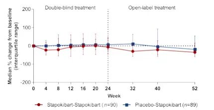 北京同仁医院李瑛等研究者报告的事后分析旨在评估CROWNS-2 III期研究中司普奇拜单抗治疗期间CRSwNP患者外周EOS计数随时间的变化情况。共有179名重度未控制CRSwNP患者接受了研究用药并纳入本次分析(司普奇拜单抗组:90例;安慰剂组:89例)。两组患者的基线特征总体均衡。在整个治疗期间,患者外周血EOS计数总体保持稳定(图3)。